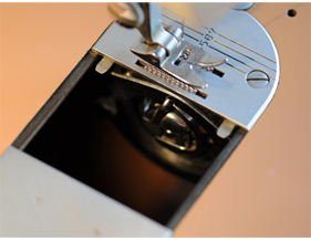 Bobbin access is beneath a small slide plate. The bobbin is encased in a bobbin case mounted vertically. The presser foot is 1/2 inch wide with generous amount of feed dogs in a balanced arrangement providing excellent straight fabric feed.