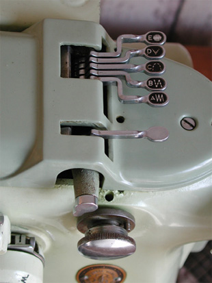 We were told by a dealer that the 319 was a "bust" for Singer because of its complexity. Apparently seamstresses were a bit intimidated by all the levers, dials and cams. The rotating external cams were something she didn't want to get her flaxen hair caught up in. It also was apparently a point of interest for little boys with curious minds. This probably accounts for the relatively short period of production-- from 1955-57. Made in Bridgeport, Connecticut at the old Wheeler & Wilson facility (hence the "W" designation in 319W). We have seen other 319Ws in green and black.