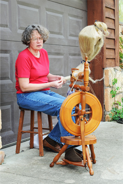 Elizabeth is spinning flax on one of her first wheels. The wheel has a flyer--rather than a spindle. When the flax is spun, it becomes linen. Flax is dressed on a distaff which permits it to be fed nicely into the flyer. Obviously, flax fibers are considerably longer than cotton or wool fibers. The flax she is spinning has a nice straw color. Probably several years have elapsed since the seeds were planted to grow this flax. There is a lengthy process involved in processing the plant before it can be spun.