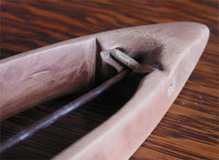 The image above shows how four different carvers treated their shuttle's bottoms after drilling three holes to create a cavity. The left shuttle shows that the pilot screw barely penetrated the bottom. The remaining shuttles show how pilot holes were dealt with.