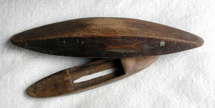 Shuttle eyelets show different treatments. Some eyelets are simply holes carved generally in the center. We have several examples where the opening is carved on the end of the spool. However it seems this configuration would pose problems in maintaining consistency as the shuttle is tossed from side to side.