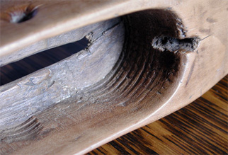 There are several examples we have seen to reduce this effect. The image above left shows how small brads were driven just inside the eyelet and its surface now shows no sign of wear. Note wear on the unprotected eyelet hole on the right-hand image.