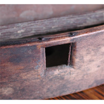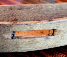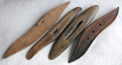 The bottoms of these shuttles shows various treatment of the underside or the side that slides across the warp threads. This is done in an effort to reduce friction or drag. From an engineering standpoint, longitudinal grooves also produce directional stability like sled runners. The bottom of the left shuttle is unadorned. The next shuttle, which was carved entirely by hand has a concave depression carved from one end to the other. The third shuttle was formed by a brace and bit as explained above and the maker cleared the wood between the three pilot holes and also added rails on either side. The right-hand shuttle shows a raised area around the shuttle perimeter. Wood between the three pilot holes was not removed