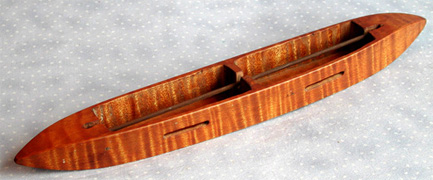 Double-boat shuttles carry two bobbins. Two threads of the same or different colors or sizes can be woven simultaneously. This beautiful piece is made from tiger maple and has elongated eyelets.