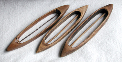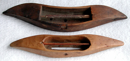 Below are two different examples of boat shuttles. The top shuttle which is lenticular shaped is probably of Eastern European origin. The lower sinusoidal shape is American and Western European. They serve the same purpose. Other than the footprint, significant differences can be seen in the bobbin size particularly in its length and thread storage capacity. Thread which exits the shuttle normally in the center would draw more evenly from the lower example. The top model is slightly shallower which would require a shorter shed of warp threads.