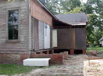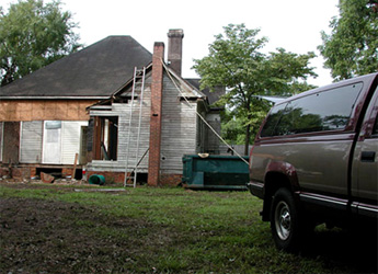 We believe the chimney was built on the back of this room when the kitchen was moved indoors. Once again the Georgia Tractor (actually our Chevrolet truck) was useful. We hooked a long rope to the back of the truck and to the chimney top. This raised the rear wheels of the truck off the ground loosing traction so we used 4-wheel drive.