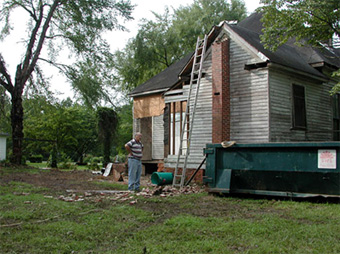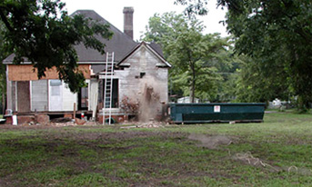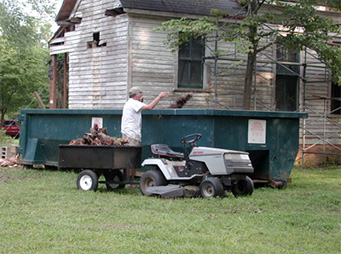 Two dumpsters were needed to remove the old debris. What lumber was not salvageable, was tossed into the dumpster. Neighbor Dave was invited to toss in his old tree stump.