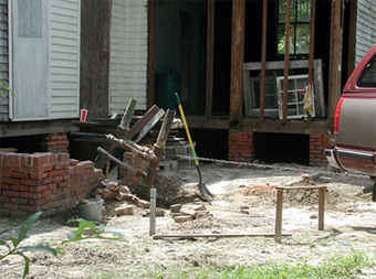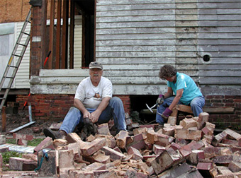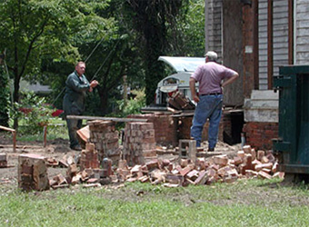 The chimney brick was needed to veneer the new concrete block foundation, so we began cleaning all the old brick. Old mortar contained little cement so the mortar separates from the brick quite easily.