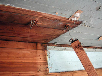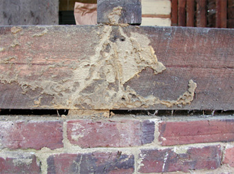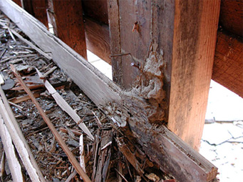 The main reason for removing the rear of the house was termite damage. Termites had found their way into the attic. In the image can be seen where they completely destroyed timbers. Below can be seen remains of their mud trails they built to avoid daylight.