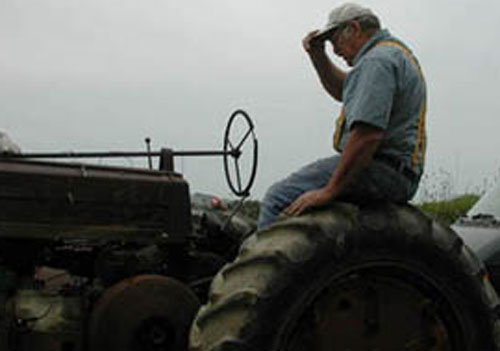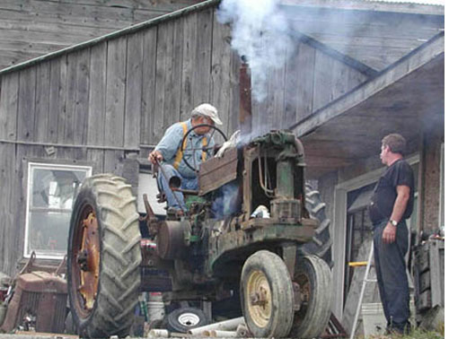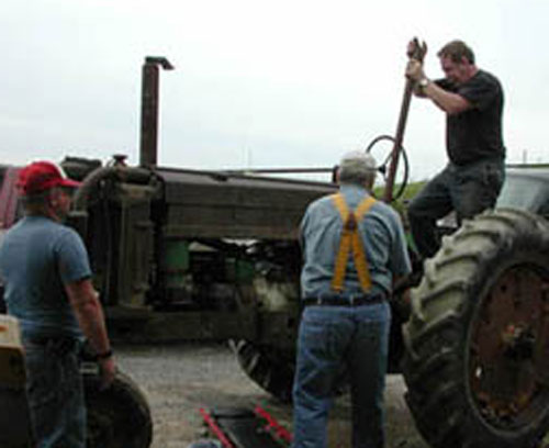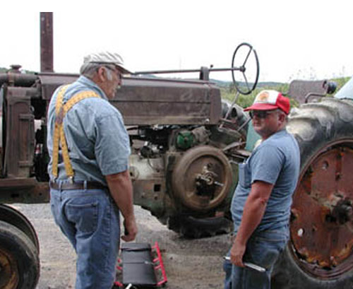 Jim and John (Elizabeth's older brother who had used the tractor on Grandpa's farm) discuss seized engine. The tractor had sat idle for a considerable length of time and the engine had seized. When the engine would not turn over, we first expected starter failure. However, after removing the starter and seeing that it worked properly, we concluded the engine was seized. We thought of trying to pull it and engaging the clutch, but we have heard horror stories of breaking gears using this technique.
