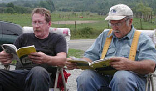 Jim and William are looking at the service manual and operator's manual trying to figure out why they could not get the tractor to fire. We replaced electrical components (plugs, points, etc.) and gave each cylinder a shot of starting fluid.