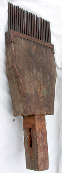 The wooden item is a flax break. A flax break is a set of intersecting wooden blades that force the retted flax straw to snap into short sections which then fall away from the fibers. Our break has two blades pointing down and three pointing up. Flax is "broken" when forced to bend into the shape of a W. A central pith-like core falls from the stalk. Usable flax fibers are on the outside of this central core much like fibers in celery stalks. Flax must be properly retted for this stage to be accomplished properly.