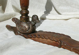 The bundle of prepared flax fibers were tied to the finial on the top. This keeps the almost three-foot fibers from tangling during the spinning process. While many flax spinning wheels have a built-in distaff, this creation permits the spinner to sit on the flat board and position the flax in a most comfortable and efficient location. While this particular distaff may be ornate, some versions are nothing more than a tree branch. A set of initials are carved in front of the duck indicating that this may have been a gift between a man and his true love.
