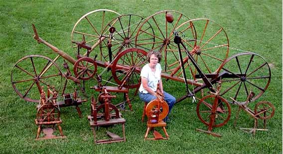 We had been picking up spinning wheels for a couple years and being that most of the collection is in storage, we began to lose count of how many and what kinds we had. So bright and early one summer morning, we pulled most of the wheels out of their various locations and assembled them on the front lawn. We had more than a couple raised eyebrows from the passing neighbors.