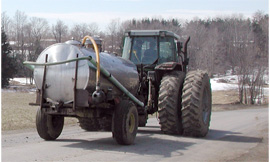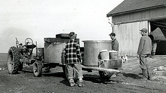 In early days, wooden yokes were used to help carry buckets of sap. One processor told of his ancestors using a yoke to carry two buckets and their hands to carry another two buckets though the woods. In the old photo above, a tractor replaces the team of horses used to transport the tank of sap to the sugar shanty.