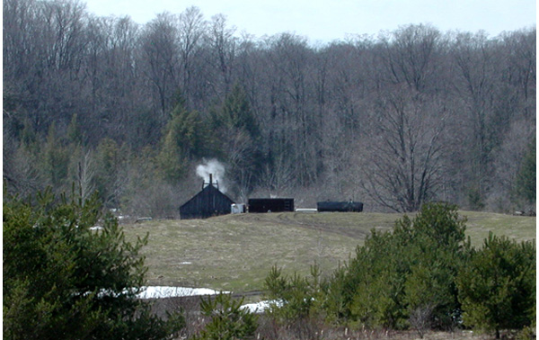 When looking for maple sugar shacks, it is easy to spot their plume of steam in distant fields. The steam comes from evaporation of water from the sap reduction process and not smoke from the fire.
