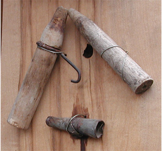 While the nature of tapping sugar maple trees has remained unchanged over the years, technology has seen minor changes to the spiles. On the left is a cast metal unit with built-in hook for holding a bucket. (Its use can be seen above.) Note also a stop which determines the depth for which the item is allowed to penetrate the tree bark. The newest spile is made of plastic and since it is connected to a hose, there is no facility for hanging a bucket.