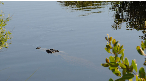 Looking like a log this American Alligator keeps its nose and eyes above the water surface. It moved slowly along the surface not even making a wave as it searched for food--or just loafed.