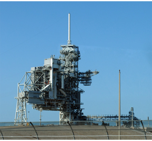The image above shows construction of a launch platform which will replace the current Shuttle program. We ran into a contractor staying in our motel who was working on this massive facility. Our tour guide explained that the purpose of the tall structure on top is a lightning rod, which is also like several others planted around the complex. EMP caused by lightning can damage spacecraft electronics. The foreground fence is designed to keep out alligators as well as people.