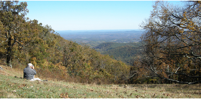 We climbed to the observation level of this old fire lookout tower. It is perched on a lofty knob with a panoramic view of the Blue Ridge Mountains.