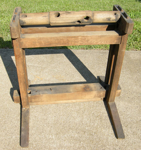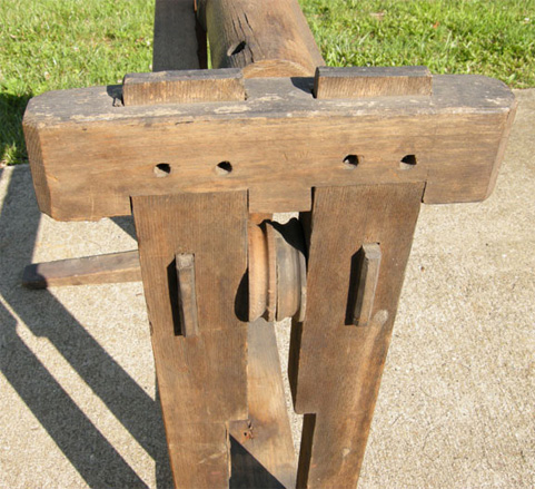 Mr. Possum Jim, I believe this device would have been used in a sawmill to lift beams for sawing, it would take two of the devices to lift a beam to feed a saw. I recall seeing a post and beam house here in Georgia, 12"X18" beams with mortise and tennon construction. The mechanics of this machine uses a double block pully arrangement, thereby doubling the lifting power of the device. I am guessing on what this is, but it seems logical.